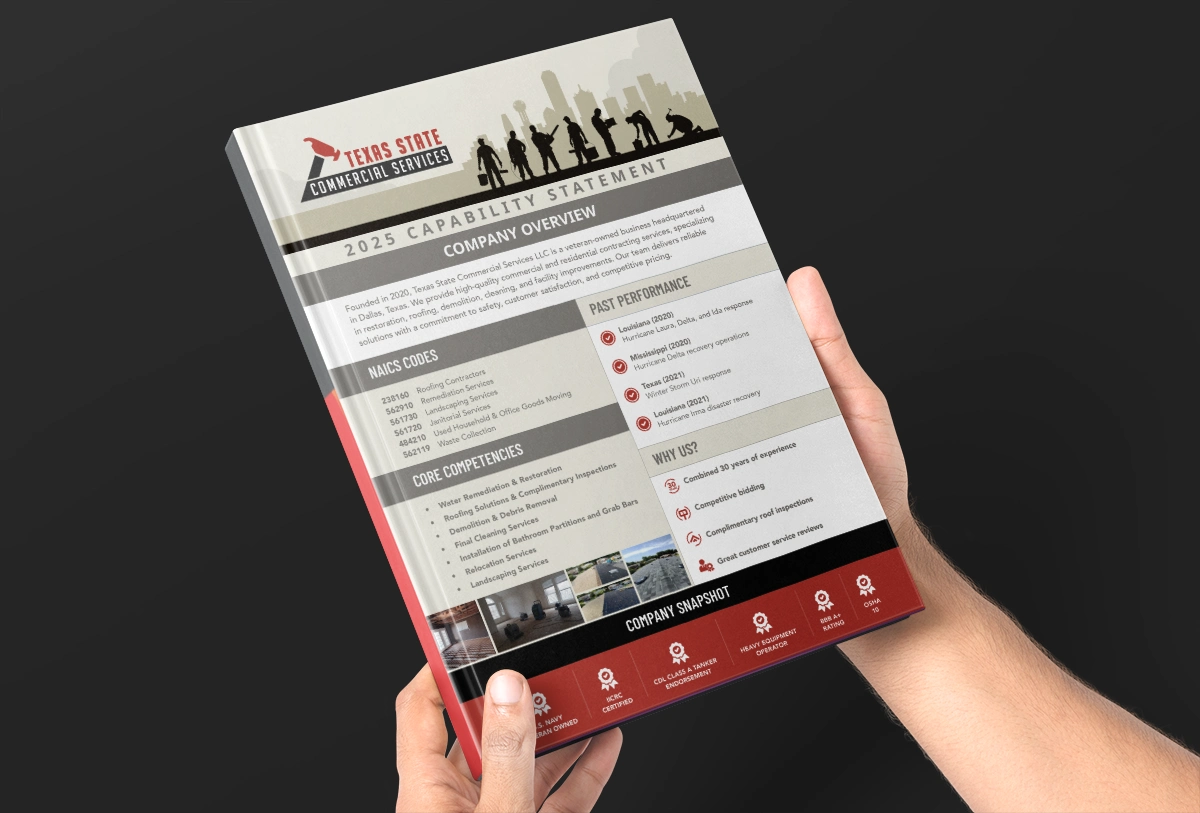Our Capability Statement is a concise document that highlights who we are, what we do, and why we are qualified to perform the work. It serves as a marketing tool for government agencies, prime contractors, and clients seeking trusted partners. By showcasing our core competencies, certifications, and past performance, this statement demonstrates our experience, reliability, and readiness to deliver quality results on every project.